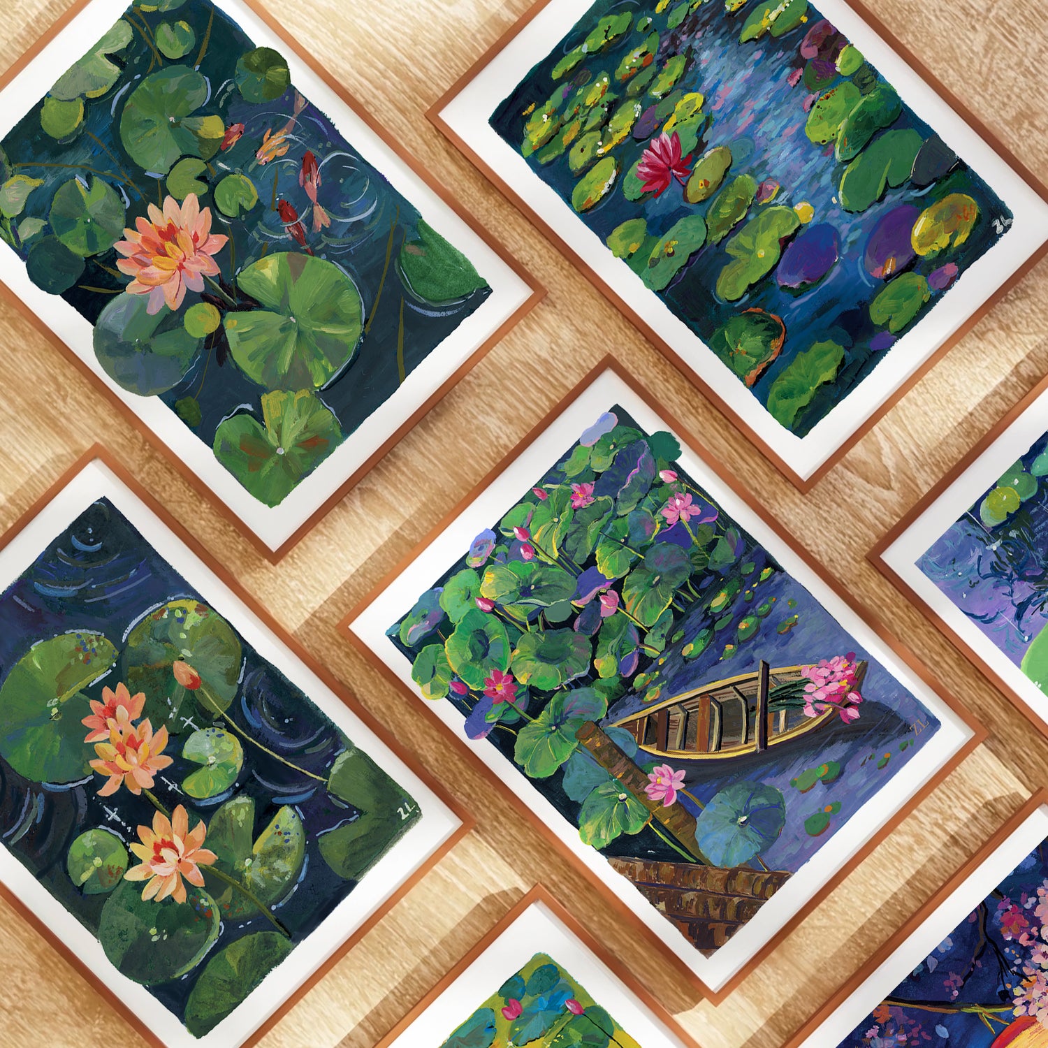 These vibrant yet calming gouache paintings capture koi fish swimming through a...